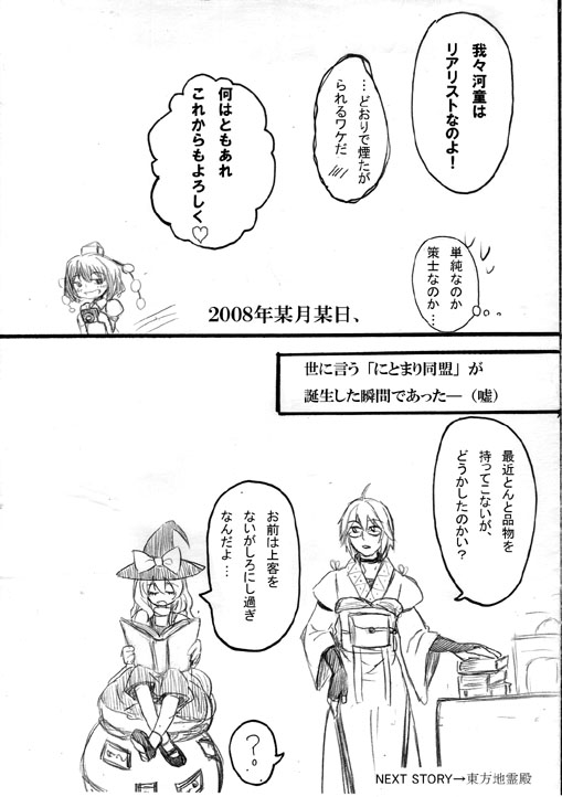にとりと魔理沙が勇儀さん他地底メンバーの接待に奔走するおはなし。